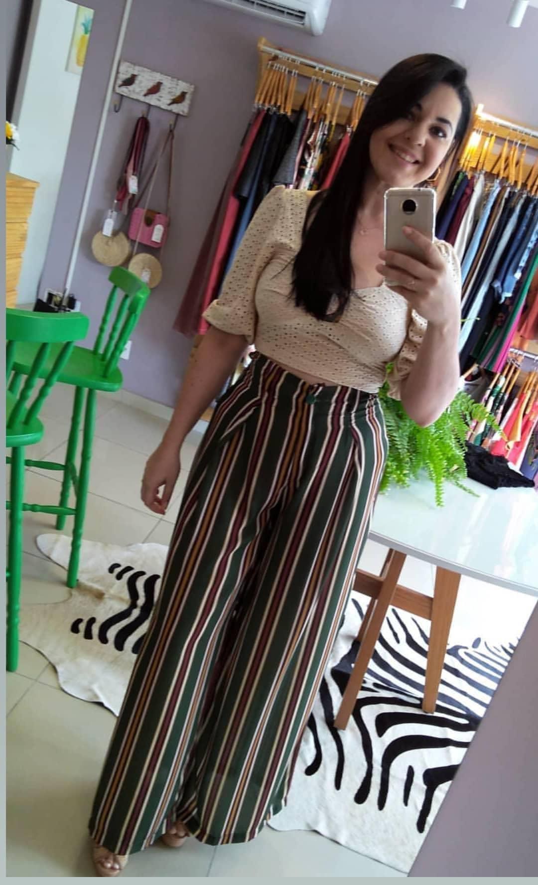 Calça pantalona da marca Closet, boca super larga, listras com predominância verde, tecido de crepe, cintura alta, super elegante e confortável.